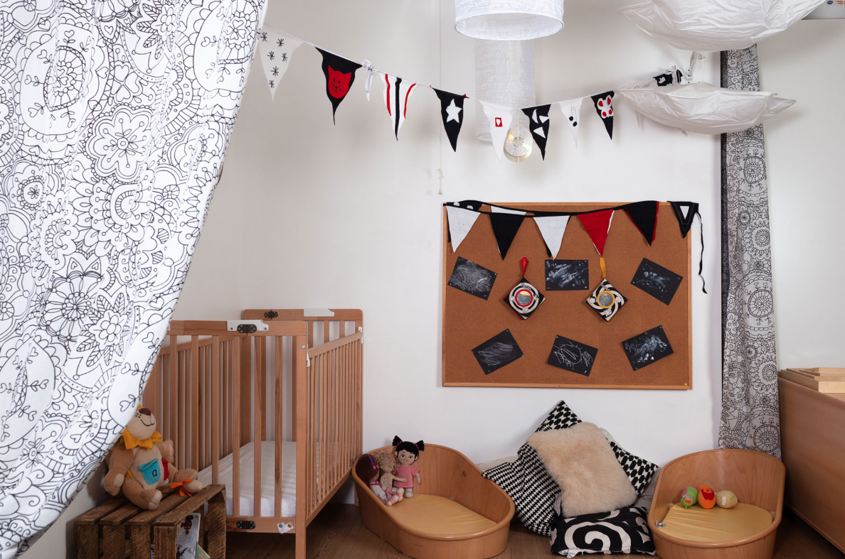 The nursery area is painted in soothing pale grey tones and contains dollhouse-shaped storage units, an array of toys and an indoor slide. A second play area can be found on the roof terrace, which is decked out with a mini racing track and water trough for children to play with.