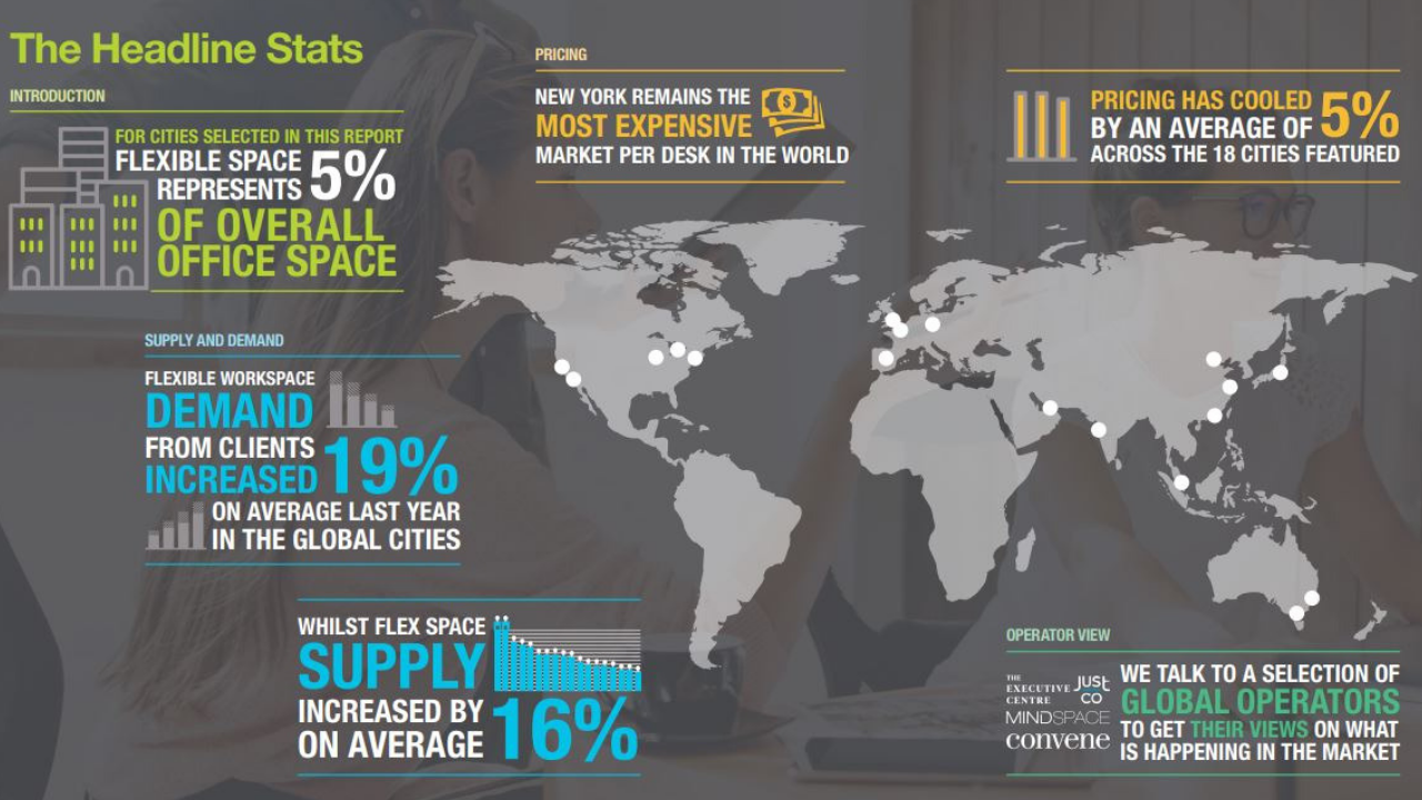 - Flexible workspace demand from clients and flexible workspace supply increased 19% on average last year.