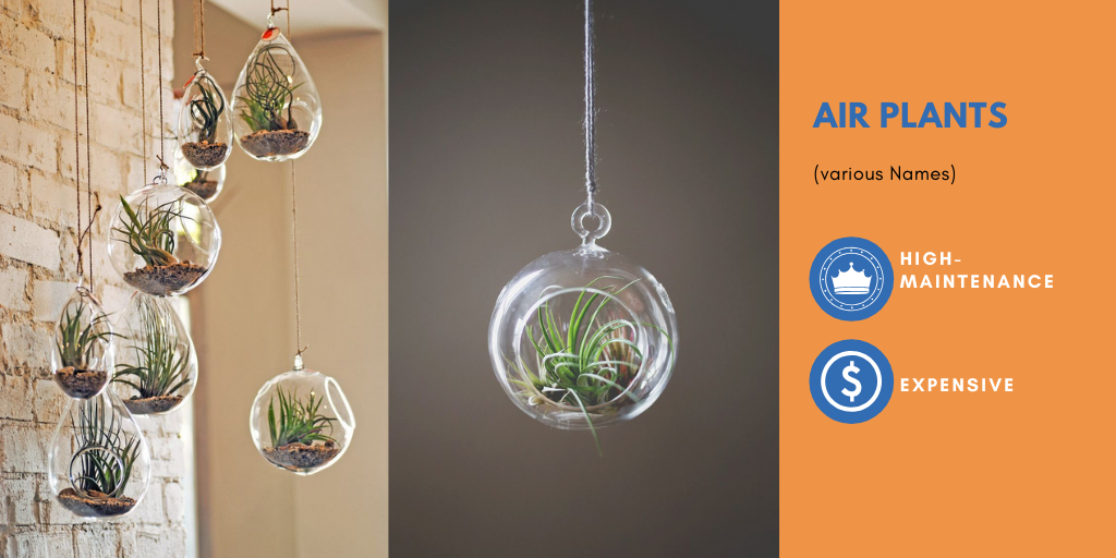 Hanging plants is a trend that anyone with the time to do it might get on board with. So if you’re willing to go the extra mile (and have the extra cash) to decorate your home or office with them, know this: they will consume you — or your time, really. These types of plants require even more attention than plants not hanging from the ceiling, or any plant for that matter. They need bright sun, but indirect. They need to be soaked, but dried regularly. And in between these two, they require mist to thrive. Also, if you struggle with not-so-severe OCD and stress about things not being clean and tidy, air plants just won’t do. The glass that contains them will stain and most certainly you’ll find them dripping water onto the floor from time to time. Talk about high-priced maintenance!