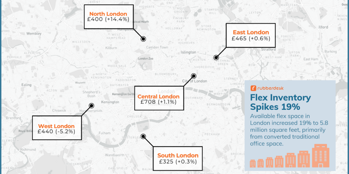 North London’s 14% rate increase to £400 per desk reflects the introduction of higher-grade converted space rather than organic growth, with enterprise offices actually declining 18% to £585 per desk.