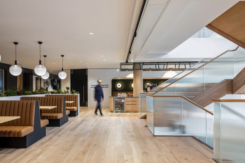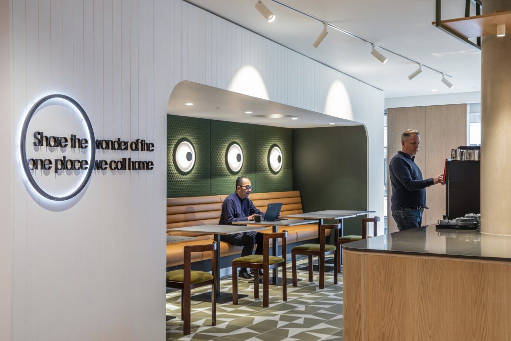 Similarly, positioning an open-plan kitchen with communal tables and cozy nooks as a centralized gathering space will encourage an organic sense of community. Taking inspiration from a favorite café, for example, this space can turn lunch breaks into moments of connection and creativity. Introducing design elements like welcoming lighting and soft seating creates an environment where employees feel comfortable and open to engaging with colleagues.
