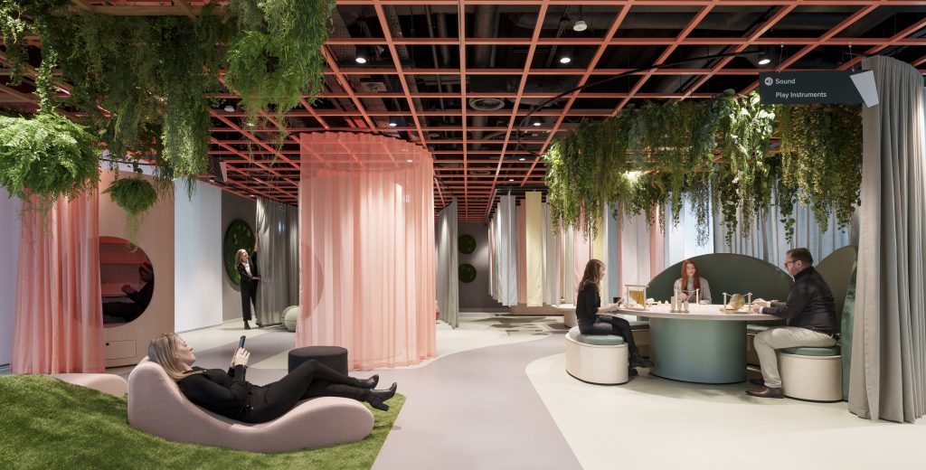 This can look like lush greenery, indoor trees, water elements, ample daylight, large windows, and outdoor terraces. The workplace “park” can also take more direct inspiration from public parks, encouraging mindful breaks and combating mental fatigue with specific areas defined for relaxation, reflection, or connection in a soothing, laid-back setting with comfortable seating.