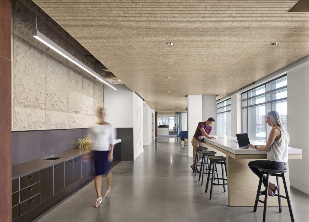 A vibrant urban ecosystem isn’t all ‘destination.’ We don’t move from point A to point B in a void. Sidewalks and passageways are alive with spontaneous interaction, casual seating options, information sharing, public art, and dynamic entertainment. When we think of hallways in the workplace as static, passive connective tissue, we’re missing opportunities.