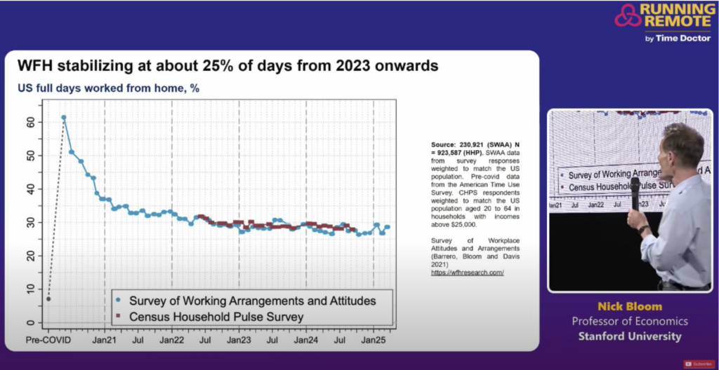 - Remote work has stabilized at 25% of workdays and isn’t declining, despite dramatic media headlines.