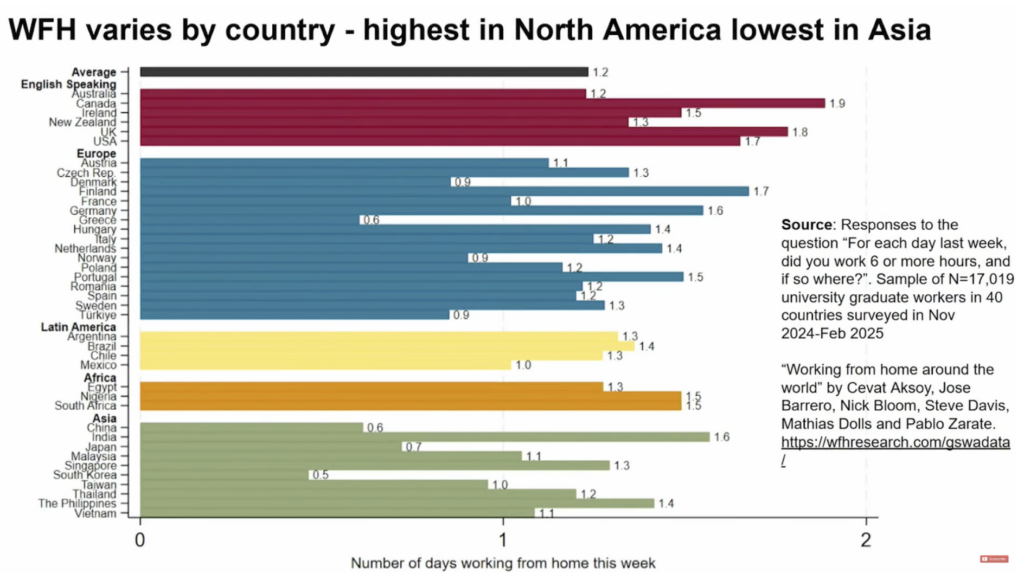 English-speaking countries lead the way, with the U.S., U.K., Canada, and Australia reporting the highest levels of remote work. Europe isn’t far behind, while Asia still lags — a trend Bloom called “a policy failure.”