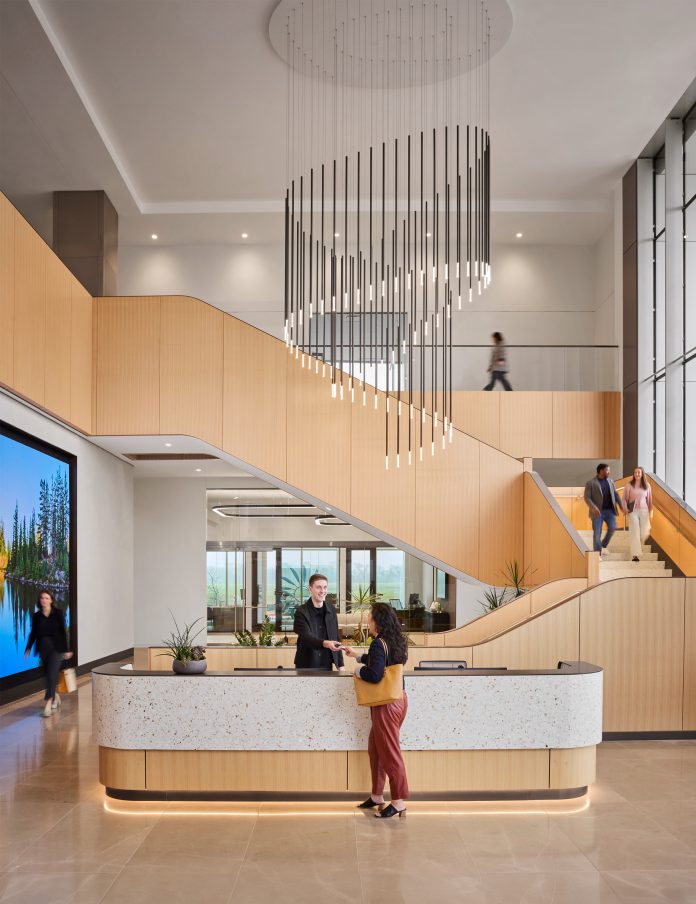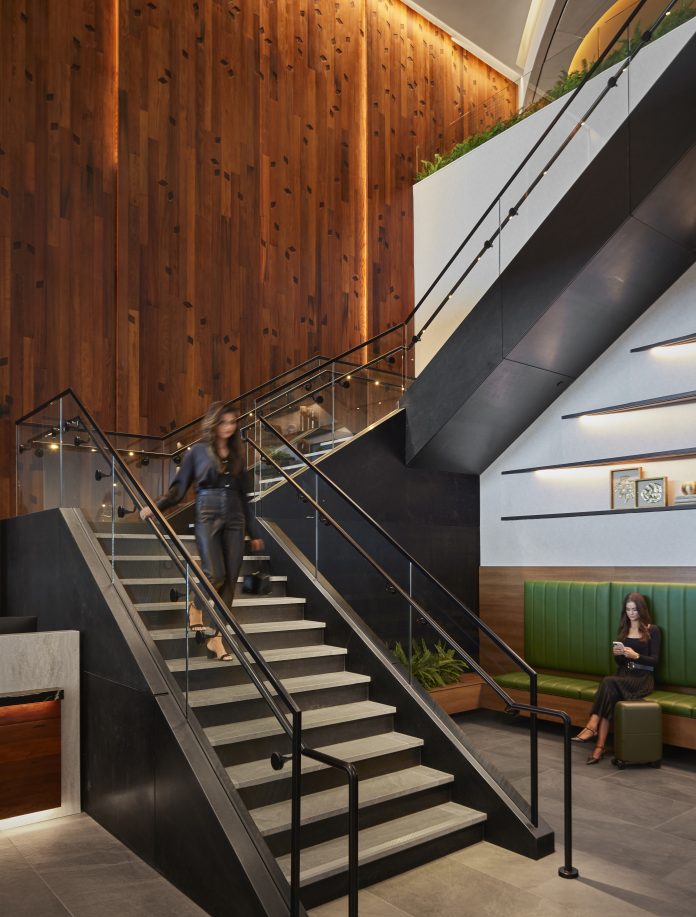 The Lesson: Workplace design can pull from the concept of evoking a warm welcome and thoughtful first impression. Designers should consider what amenities, spaces, or design features — like a monumental stair or hospitality station — are most impactful and place those in view of the entry to draw people in. Where security considerations can make this strategy difficult, designers can focus on providing an impactful, multisensory experience through scent, light, and texture.