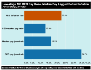 - CEO compensation vs. worker pay: From 2019 to 2024, average CEO pay at Low-Wage 100 firms climbed 34.7%, compared with just a 16.3% rise for their average median worker pay — less than the cumulative 22.6% U.S. inflation over the same period. The average CEO now earns $17.2 million, while the typical worker receives only $35,570 a year. At 22 of these companies, even nominal median pay dropped over six years.