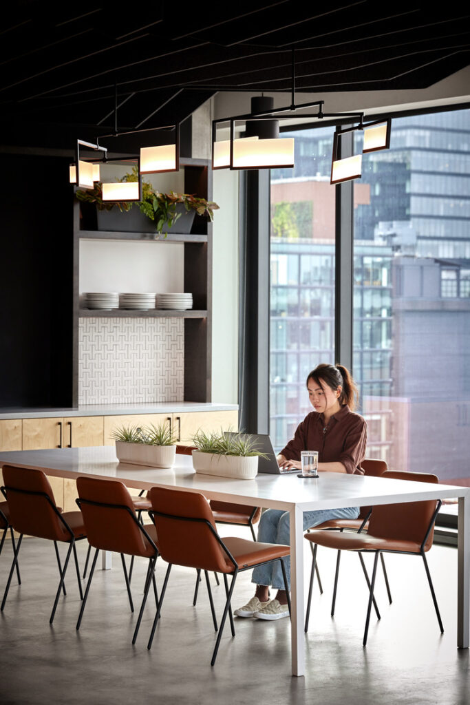 Efficiency isn’t the only priority. Employees appreciate a stimulating environment that energizes and supports creativity and innovation. Avoid the sterile, generic “blank slate” feel for ideation areas—research has shown that decorative elements, exterior views, and high ceilings for example generate and enhance creativity. Strategic amenities like dynamic gathering spaces and well-appointed break rooms designed for movement, flow, and collaboration support connection and inclusion.