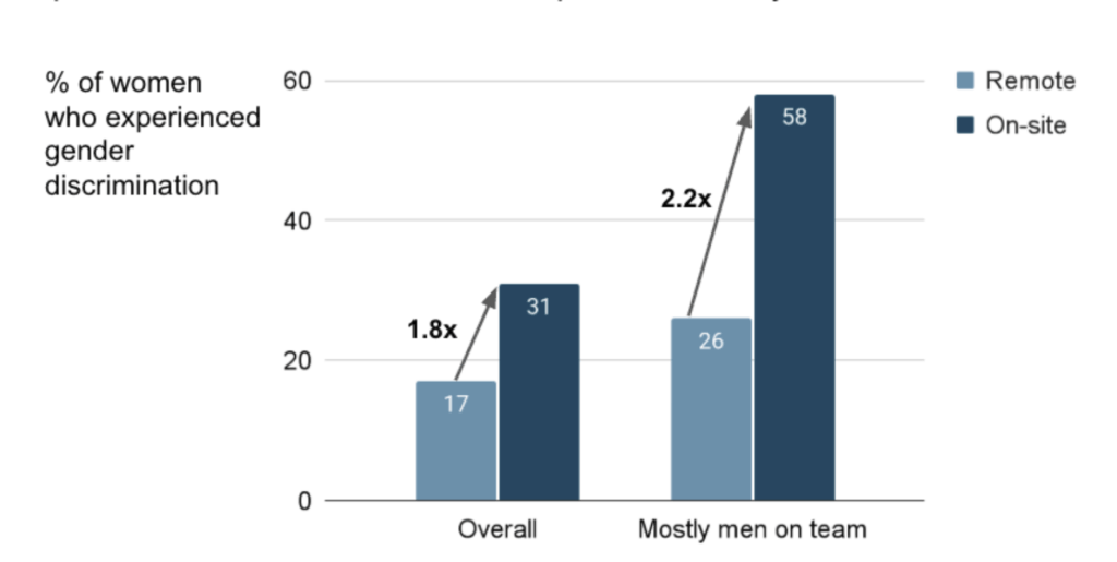 Women face nearly double the rate of gender discrimination on-site vs. remote, especially on male-dominated teams.
