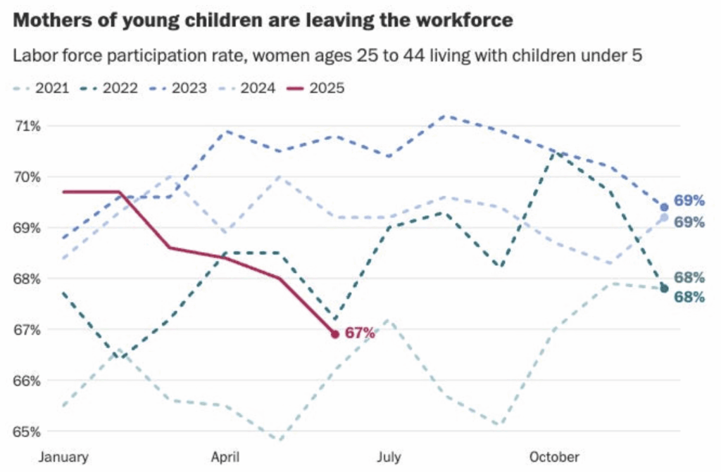 This helps explain the sharp drop in labor force participation among mothers: a three percentage point decline in just the past year, reversing pandemic-era gains. Thanks, in part, to return-to-office mandates that multiple studies have shown drive out women at disproportionate rates.Washington Post: Misty Heggeness using Current Population Survey, Census Bureau/Bureau of Labor Statistics via ipums.org
