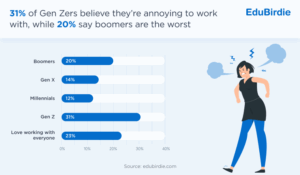 Despite their efforts, many Gen Z workers face persistent stereotypes. Criticized for being inflexible, overly sensitive, or disengaged, some have internalized the negativity. In fact, 31% of Gen Z say their own generation is the most annoying in the office.