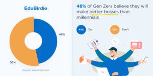 Looking forward, Gen Z is confident in their ability to lead differently. 48% believe they will make better managers than millennials, with a stronger commitment to fairness and standing up for what’s right.