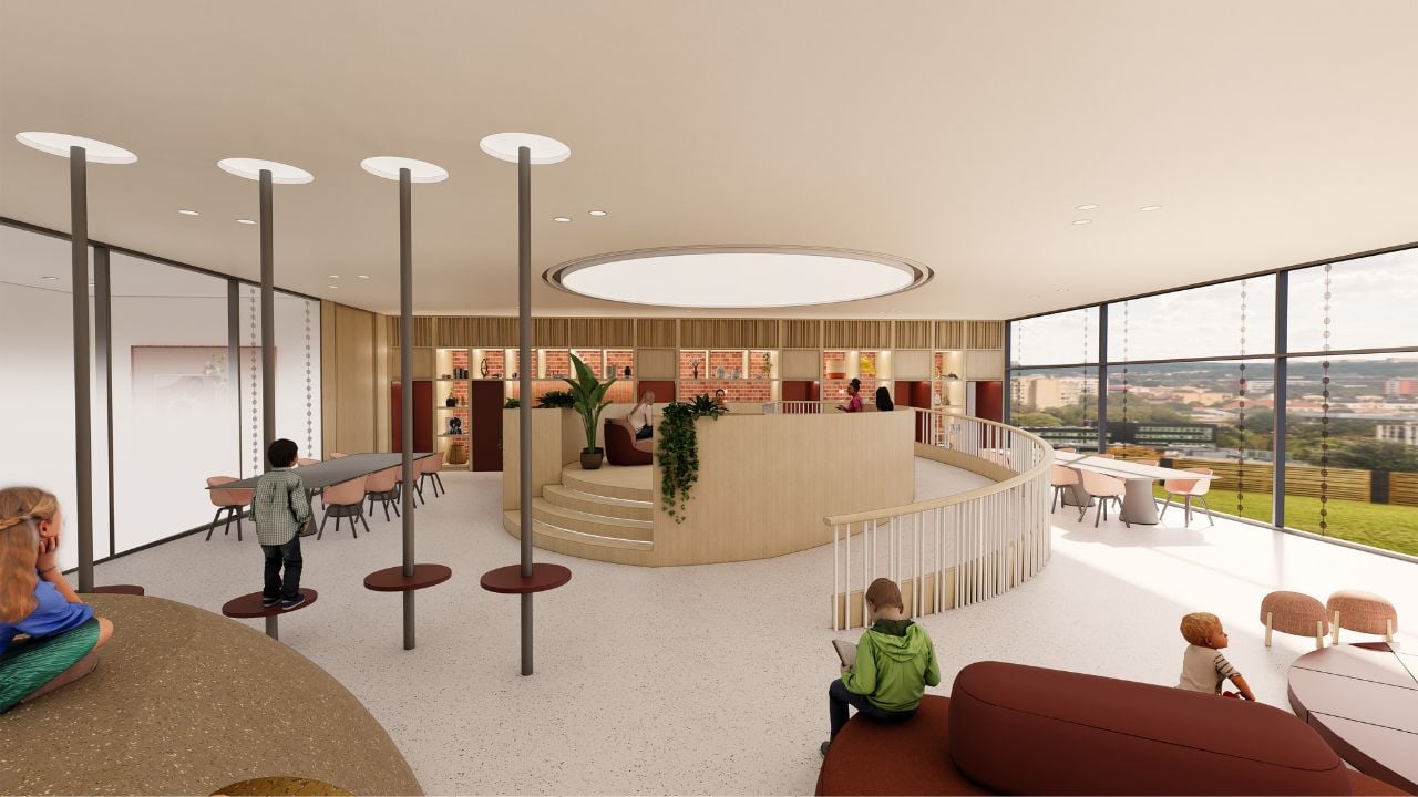 A closer look at the central podium, reached by both stairs and ramp, shows how this raised area creates a comfortable spot for conversation while still keeping a clear view of children at play. The more adult-focused side of the multipurpose space connects to the offices, mothers room, gaming room, and therapy room. Renderings Courtesy of Perkins&Will.