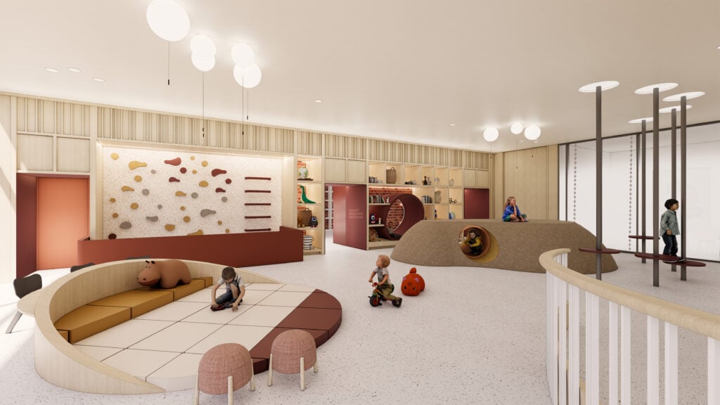 The design prioritizes both function and well-being. Wellness spaces like the therapy room, nursing space, and nap room sit alongside coworking areas, a parent lounge, and multipurpose room. This creates flexible zones where work and caregiving can coexist.