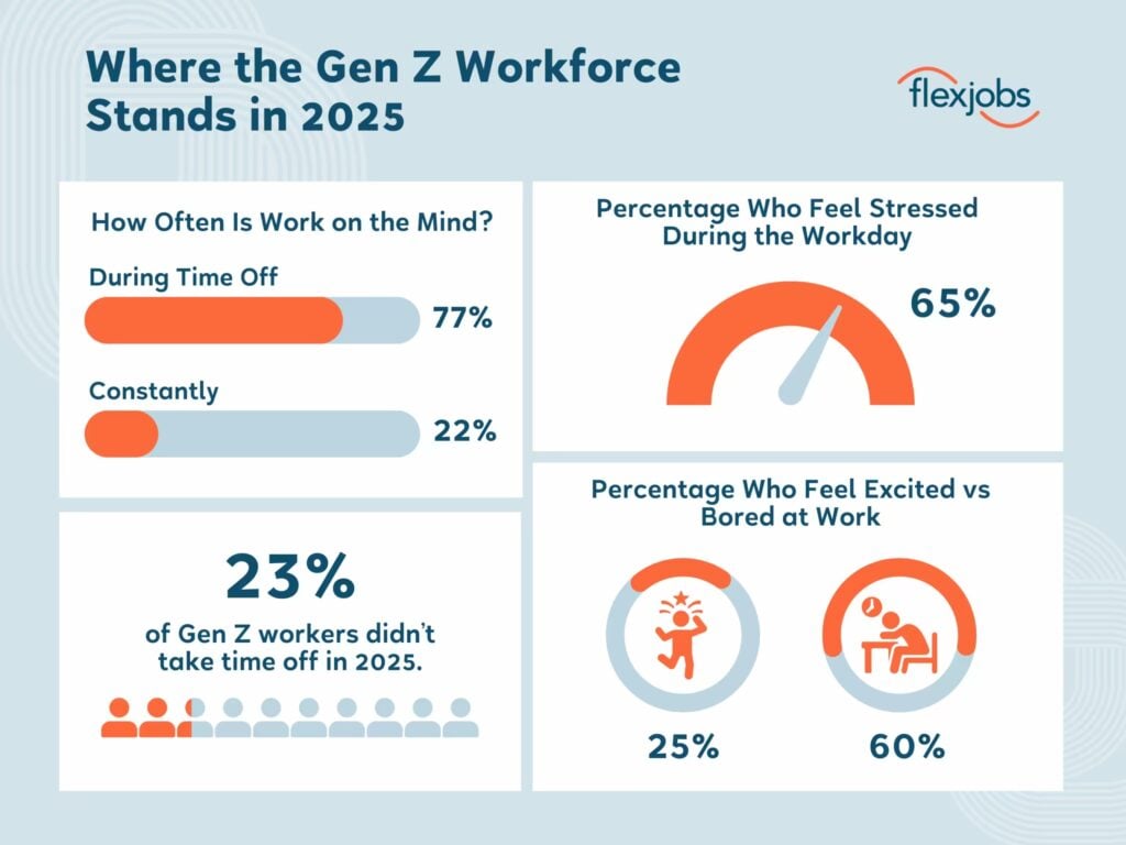 Gen Z’s early-career pressure is spotlighting issues that affect every generation. FlexJobs found that 77% of workers think about work even during time off, and a surprising 22% can’t turn their brains off at all.