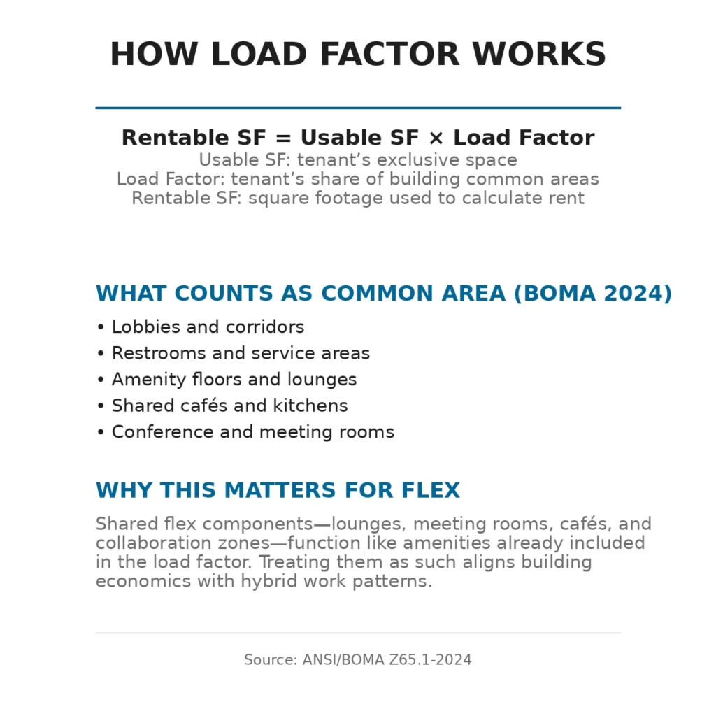 Incorporating shared flex components into the load factor aligns the financial treatment of these spaces with their role in the building.