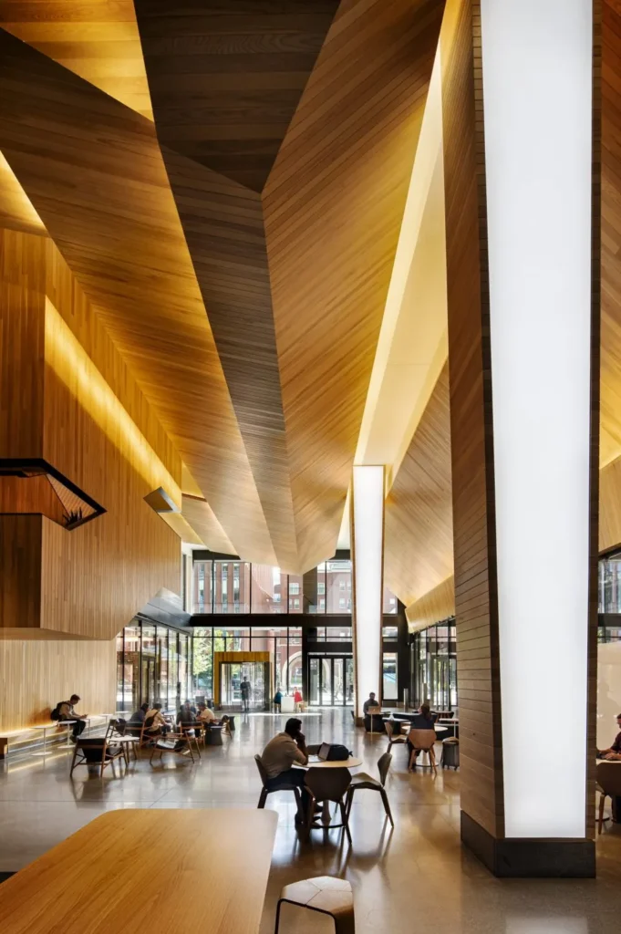 The design incorporates an abundance of natural light that transforms the space from a simple pass-through to a destination. Rotating exhibits and events in and around the space are programmed throughout the year to reinforce the lobby’s role as a true public amenity — a place where the building opens to the city and contributes to Cambridge’s creative and civic life.Â