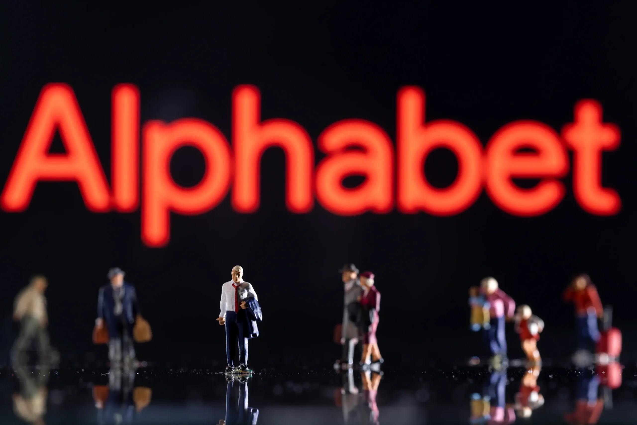 Small figurines are seen in front of displayed Alphabet logo in this illustration taken February 11, 2022. REUTERS/Dado Ruvic/Ilustration