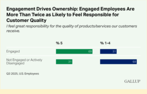 In the third quarter of 2025, 43% of U.S. workers strongly agreed they feel a great deal of responsibility for the quality of products and services customers receive. Yet only 23% strongly agreed their organization consistently delivers on its customer commitments. That gap has persisted for several years, according to a new Gallup study.