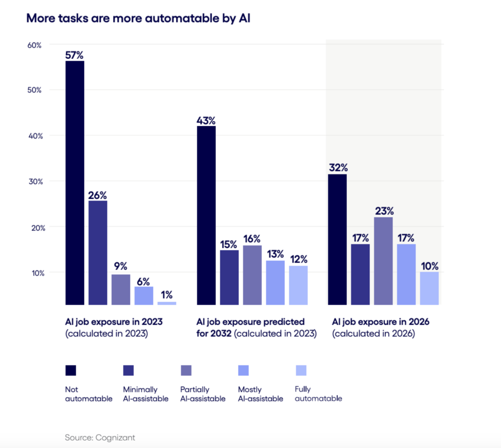 Professional services company Cognizant (number 217 on the 2026 edition of the Fortune 500) has reassessed its estimate of AI’s impact on the workplace, and the results are starker than before. They’ve updated their original forecast made in 2023 — formulated by examining 18,000 tasks and nearly 1,000 jobs from the U.S. Department of Labor occupational data — to find that 93% of jobs could undergo at least some disruption from the technology.