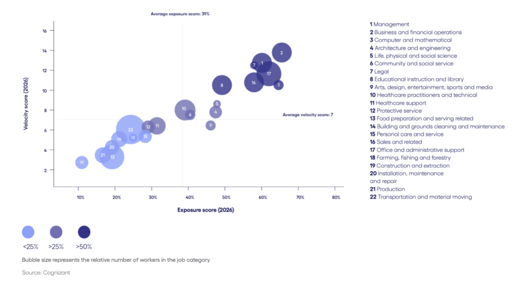 Professional services company Cognizant (number 217 on the 2026 edition of the Fortune 500) has reassessed its estimate of AI’s impact on the workplace, and the results are starker than before. They’ve updated their original forecast made in 2023 — formulated by examining 18,000 tasks and nearly 1,000 jobs from the U.S. Department of Labor occupational data — to find that 93% of jobs could undergo at least some disruption from the technology.