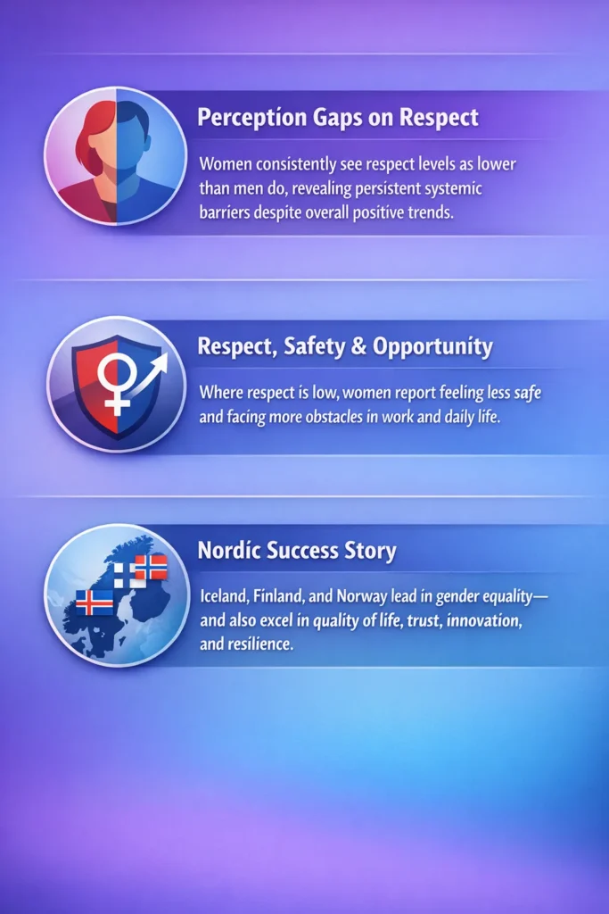 Where women report low levels of respect, they are also more likely to experience both physical and psychological insecurity, which affects everything from commuting decisions to career risk-taking. Conversely, when respect increases, women report higher life satisfaction and optimism, which in turn boosts engagement, productivity, and overall economic contribution.