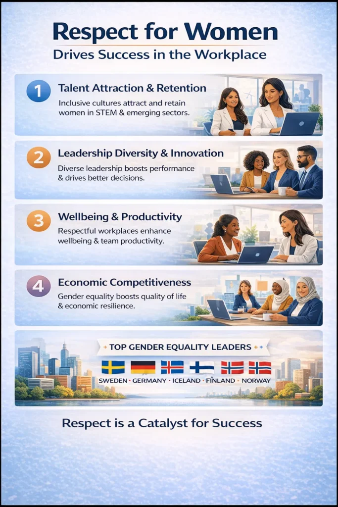 - Talent attraction and retention: Respect helps organizations attract women into emerging sectors such as technology, AI, and STEM, and retain them through life-stage transitions.