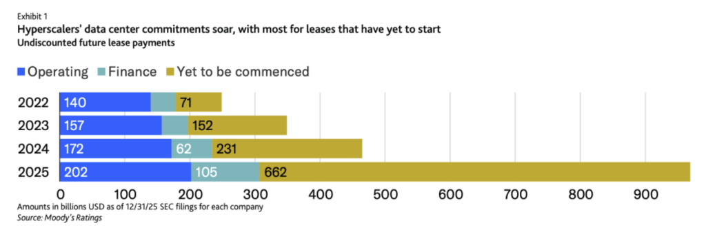 The technology sector’s frantic race to build artificial intelligence infrastructure has created a massive, financial overhang. According to a recent in-depth report by Moody’s Ratings, the top five U.S. hyperscalers have accumulated $662 billion in future data center lease commitments not yet begun that are not current liabilities and therefore sit entirely off their balance sheets. As those leases begin over the next several years, and as landlords’ obligations are fulfilled, that more than half a trillion dollars’ worth of data center activity will be recorded on balance sheets.