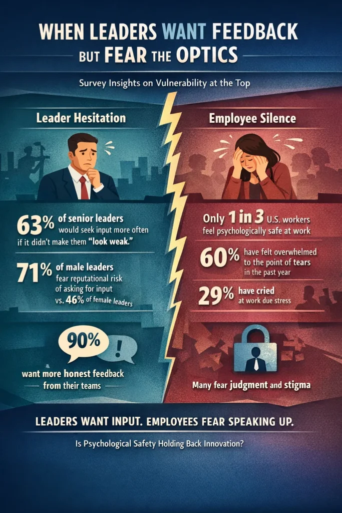 A survey of U.S. business leaders (directors and above) found that 63% would seek input more often on major decisions if they did not fear appearing weak. Male leaders were particularly cautious, with 71% expressing concern about reputational cost, compared with 46% of female leaders.