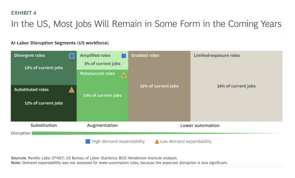 New BCG research analyzed 1,500 jobs and found that 10-15% could be eliminated over four to five years. The number that gets less airtime is that 50-55% of jobs will be restructured: AI giving workers new skills and capabilities, requiring significant changes to how teams, functions, and organizations operate. That’s the real story, and it’s a multi-year transformation, not a quarterly cost-cutting exercise.