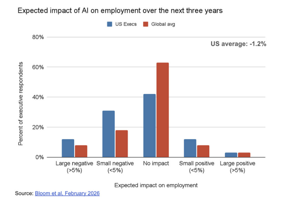Nick Bloom’s research, tapping surveys of executives across the Federal Reserve, Bank of England, and others, found that 26% of executives predict decreased employment over the next three years due to AI. In the US, that number jumps to 43%.