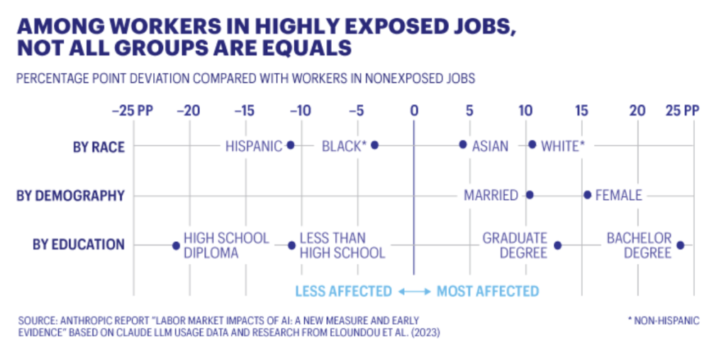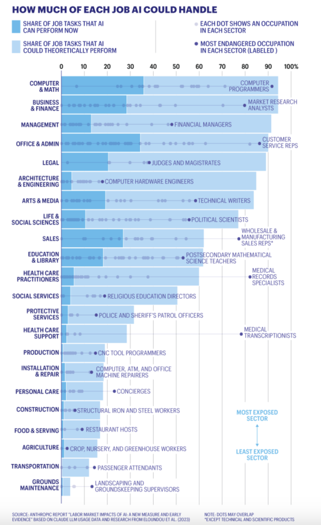 The report, “Labor market impacts of AI: A new measure and early evidence,” was based on real-life enterprise usage of Anthropic’s popular Claude large-language model. It broke down a host of professions by their “observed exposure” and “theoretical exposure” to AI — in essence, what share of the work in a given occupation Al systems can already do, and how much more they could theoretically take on.