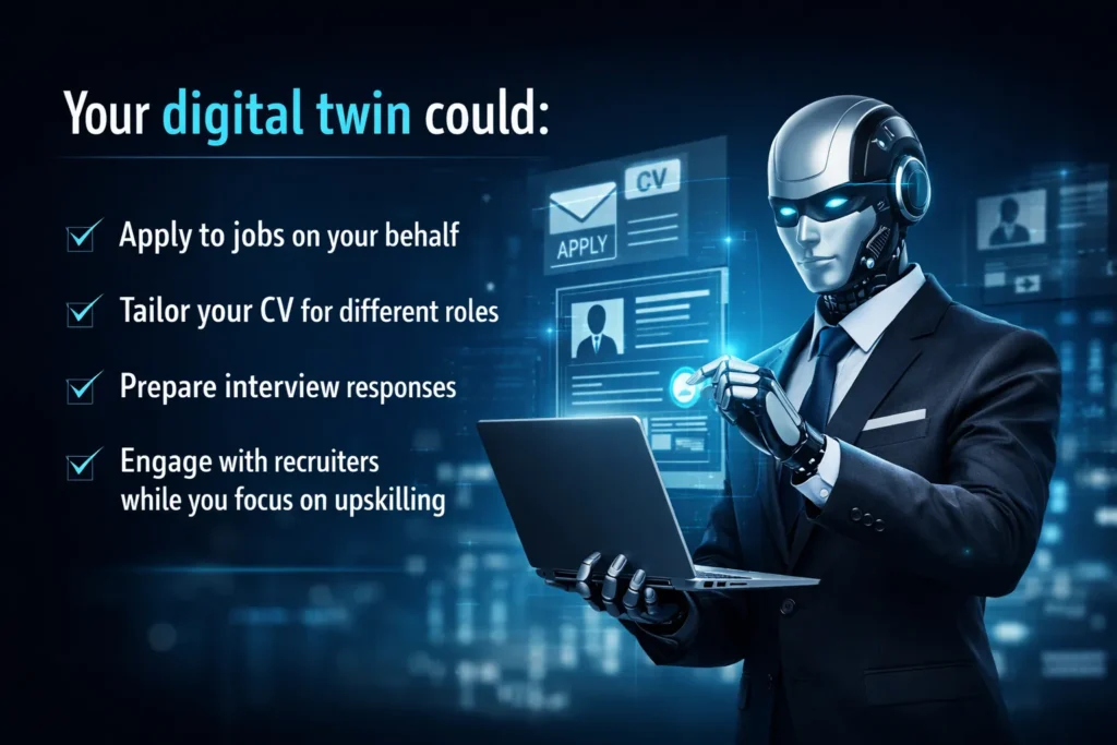 Digital twins reflect the transition toward automated, employer-driven hiring, where applications are screened or prioritized before reaching a human reviewer. Within this process, an AI-powered version can help submit applications, tailor CVs, prepare responses, and engage recruiters — expanding reach and reducing the time required for customization.
